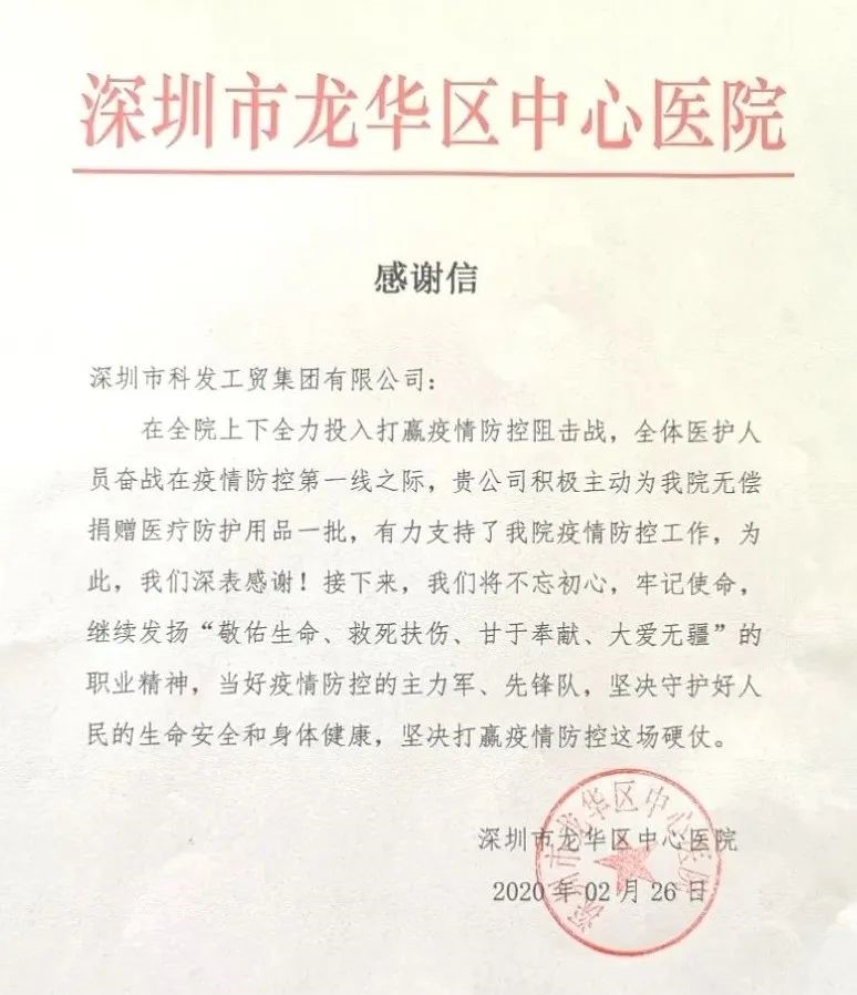 科發(fā)集團(tuán)向新田社區(qū)捐贈(zèng)愛心善款,并委托新田社區(qū)緊急采購(gòu)了一批醫(yī)療物資,于2020年2月26日送達(dá)龍華區(qū)中心醫(yī)院,為戰(zhàn)斗在一線的白衣戰(zhàn)士們助力。