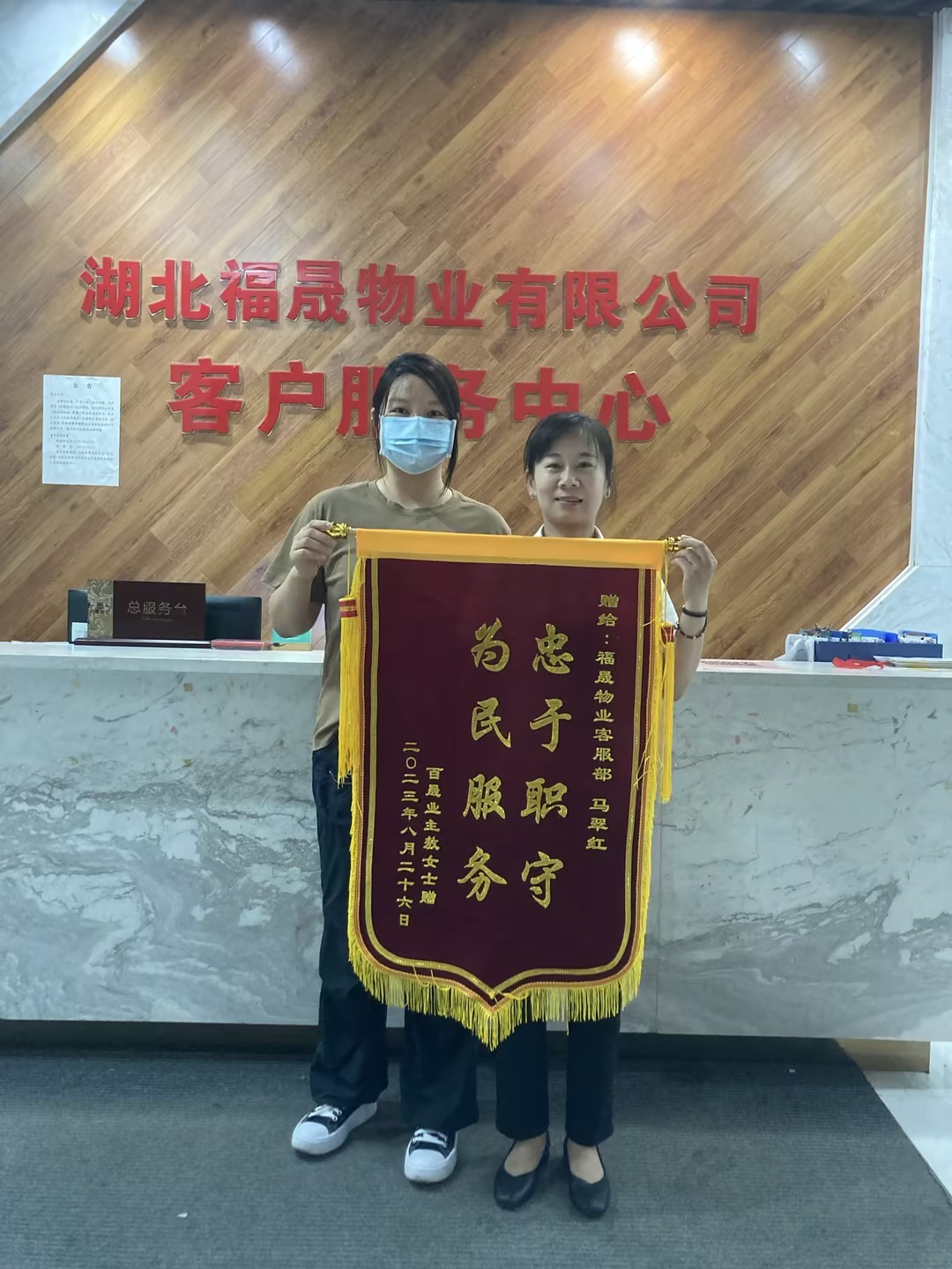 一面錦旗,一聲好評,一份滿意,是對物業(yè)服務工作人員的最大“褒獎”,每一面錦旗都記錄著感動與溫暖,每一次感謝都承載著認可與肯定。8月27日,湖北福晟物業(yè)中心先后走進了這樣的兩位業(yè)主,4-2-3002和13-2-1303的業(yè)主心存感恩之意,各自帶著錦旗來到物業(yè)服務中心,贈予樓管家魏坤珍和馬翠紅。