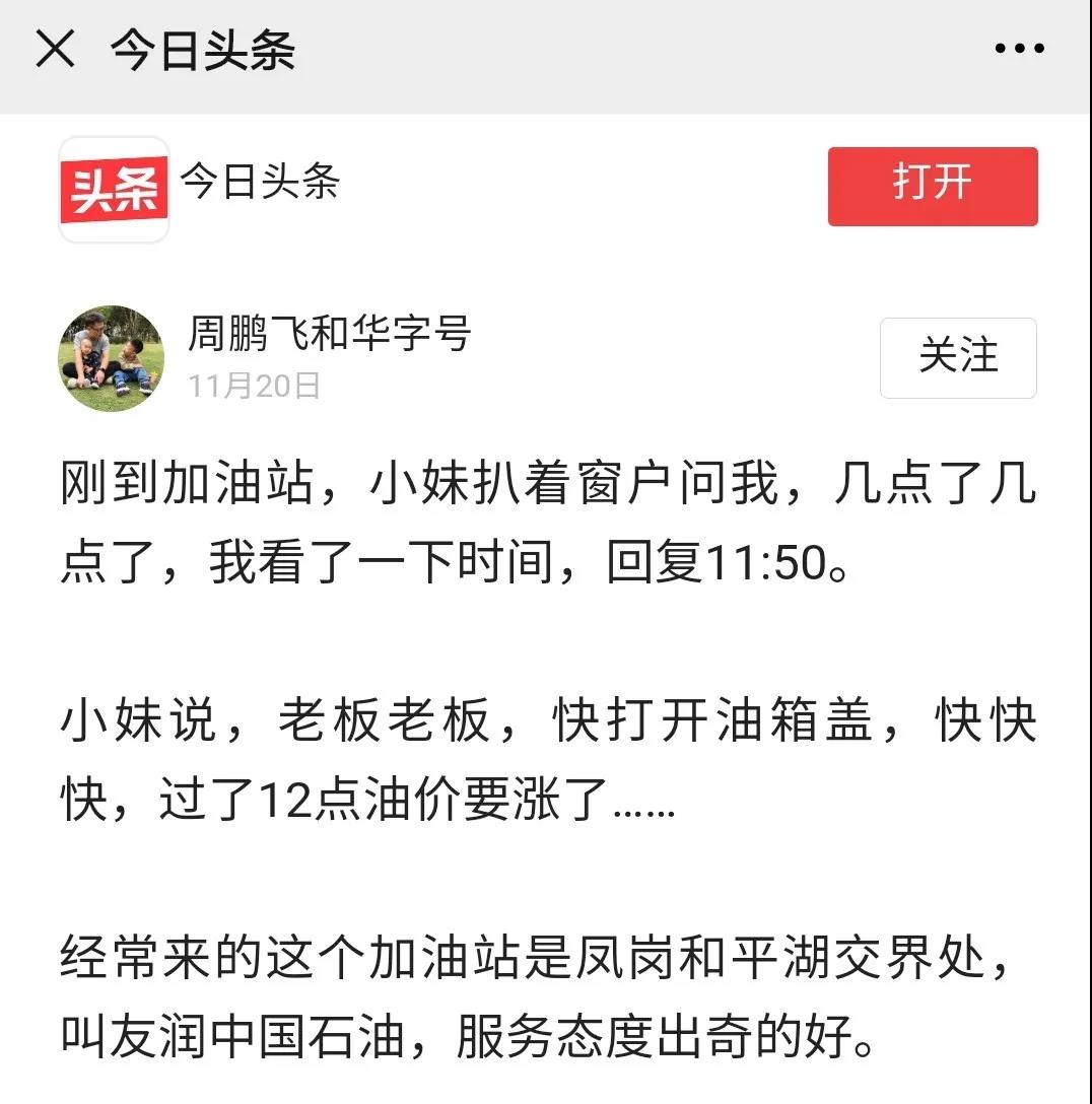 11月20日凌晨,有位顧客在《今日頭條》上分享了自己在中國石油友潤加油站的消費體驗,加油員熱情周到的服務以及維護顧客利益的舉動贏得顧客的稱贊。
