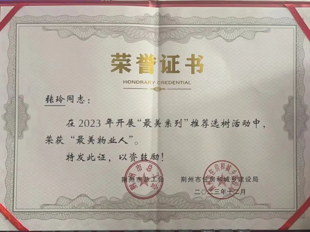 同時(shí),在2023年的“最美系列”推薦選樹活動(dòng)中,荊州市評選出了10位物業(yè)人員獲得“最美物業(yè)人”榮譽(yù)稱號(hào)。湖北福晟物業(yè)有限公司高級(jí)主管張玲玲由于在黨建引領(lǐng)的紅色物業(yè)服務(wù)企業(yè)中取得了出色成績,成為監(jiān)利市首位獲得“最美物業(yè)人”個(gè)人榮譽(yù)稱號(hào)的優(yōu)秀人才。